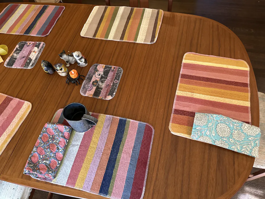 This thick, absorbent Scrap Felt Placemat / Drying Mat works as perfectly under a dish drying rack as it does on your dinner table. And the best part (we think) is that it is a totally upcycled product. We felt multiple layers of our flannel fabric strips (that might otherwise go into the waste stream) together to create a new, absorbent fabric we call Scrap Felt. We then cut and sew this unique new fabric into these Placemats / Drying Mats.