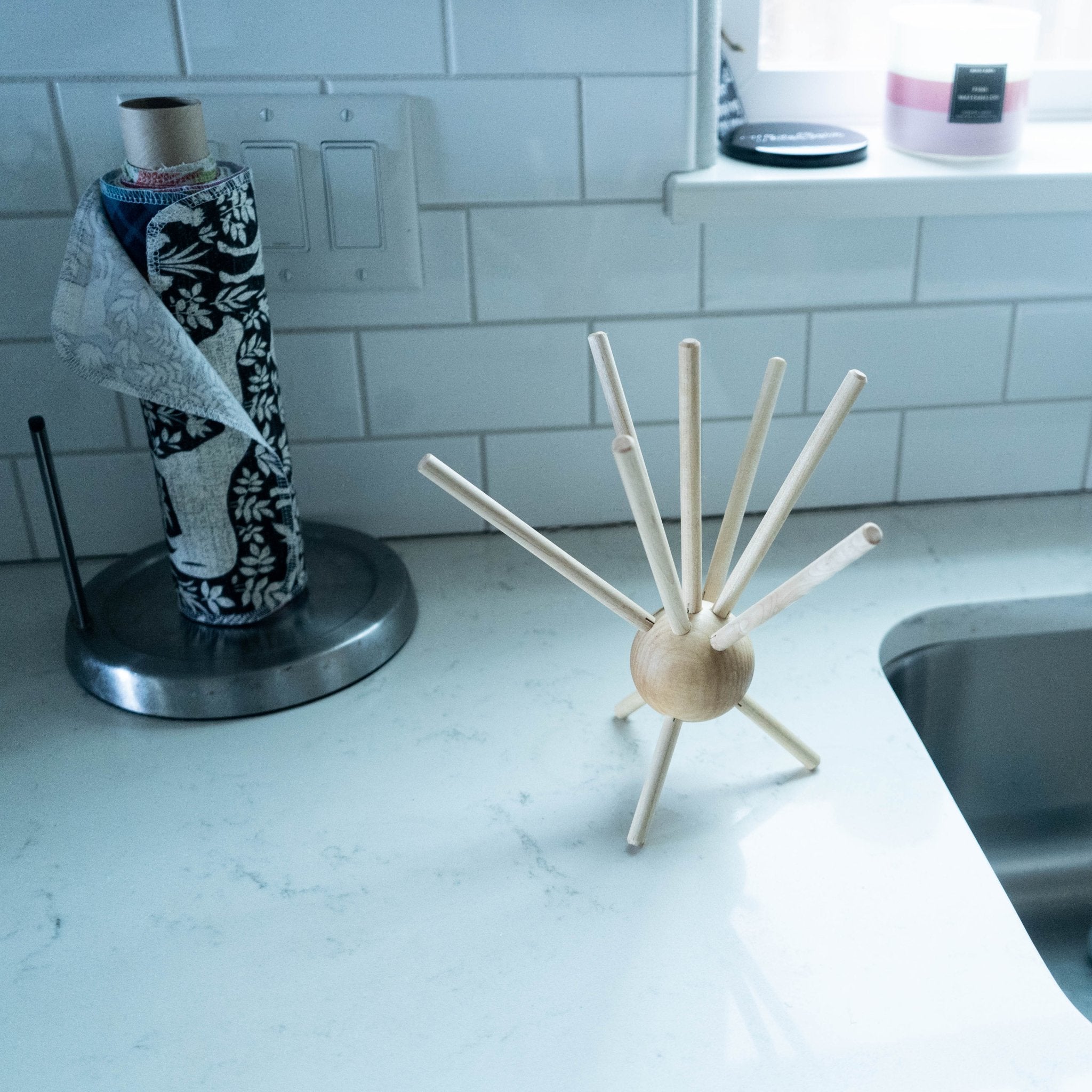 Meet the UNpaper® Bug! Our unique drying rack is 100% wood and provides a fun & functional way to dry and show off your UNpaper® Towels and other reusables. Made from USA grown hardwood with 3 (3") legs and 7 (6") prongs extending from a 2.5" sphere. Total assembled height is 9.5" tall.